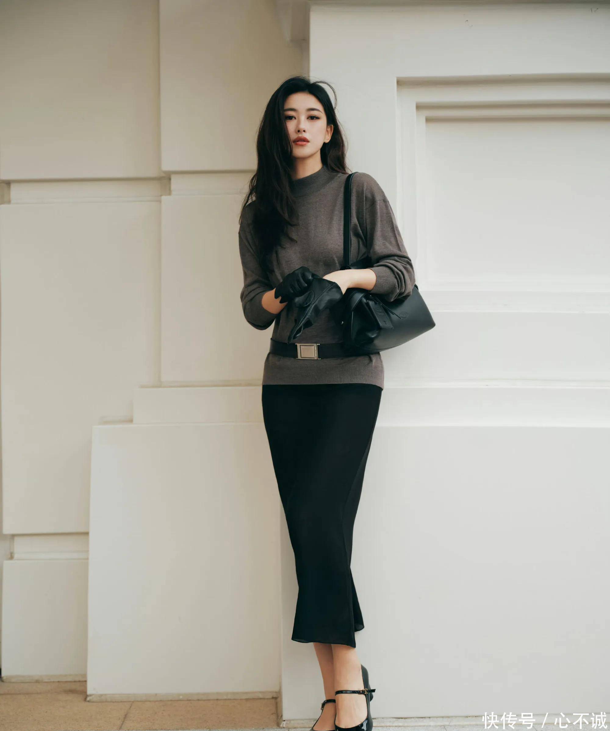 这组造型最妙的是“普通人能抄的贵气公式”:金棕针织是秋冬的“显贵万能色”,混纺纹理避免了老气;百褶裙中和了针织的厚重,玛丽珍鞋添了点少女感,哪怕是普通上班族,把“金棕针织+宽腰带+半裙”这一套安排上,也能穿出“月薪五万”的精致感。